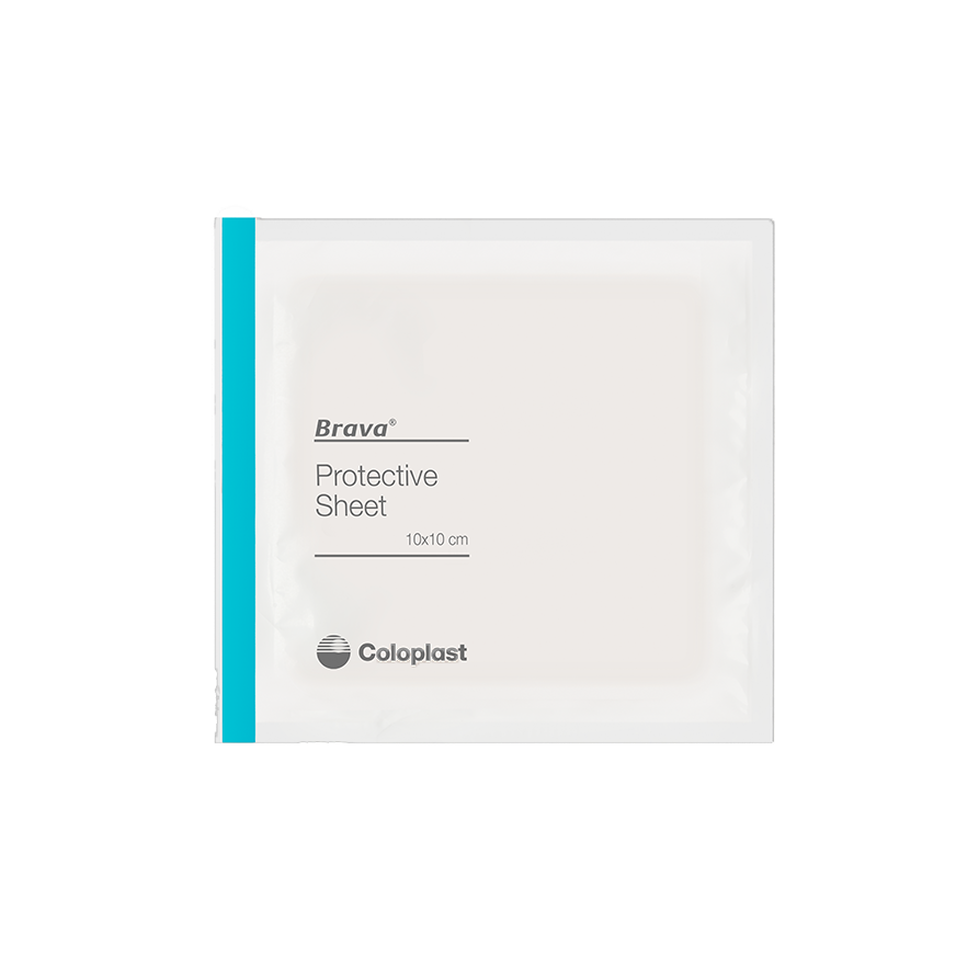 The skin-friendly Brava Protective Sheet is used under the baseplate, providing extra absorption in addition to the existing ostomy solution.It also provides a ready surface for applying a new product.